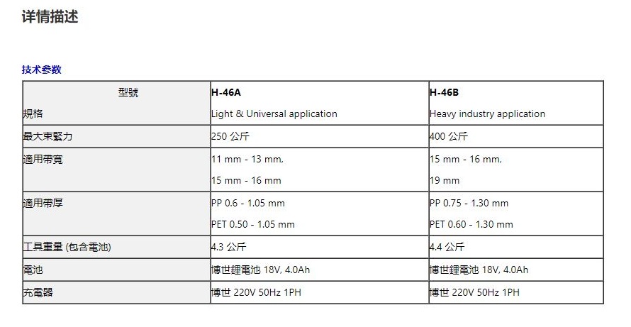 H-46是一款博士電池驅動捆扎工具。H-46具有設置靈活、收緊力范圍寬、PET&PP帶等特點,可廣泛的應用于各個工業領域。