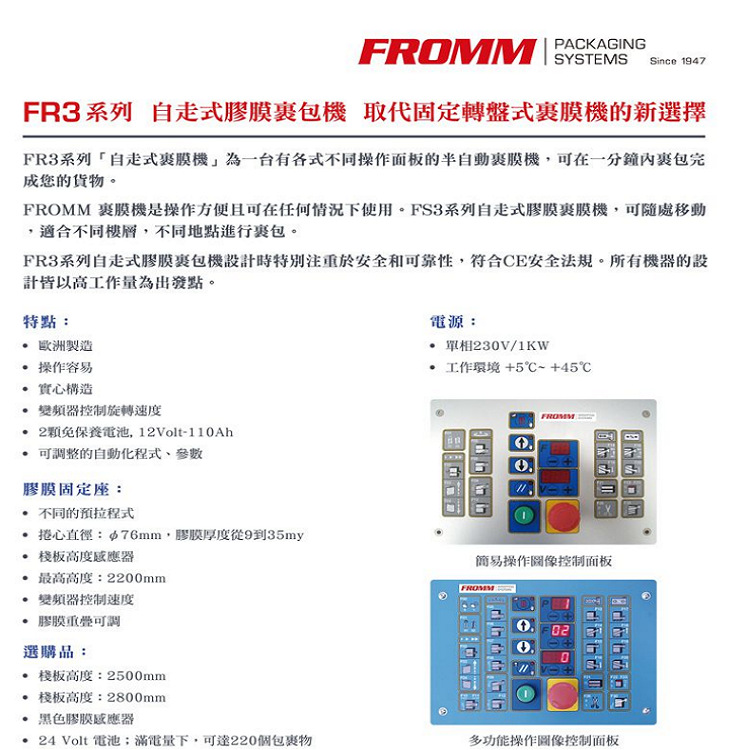 自走式棧板裹膜機FR,在電池完全充電情況下,可纏繞220個棧板。自走式棧板裹膜機FR型號:FR33x、FR35x、FR39x、FR40x。