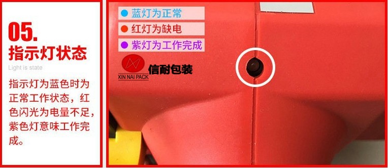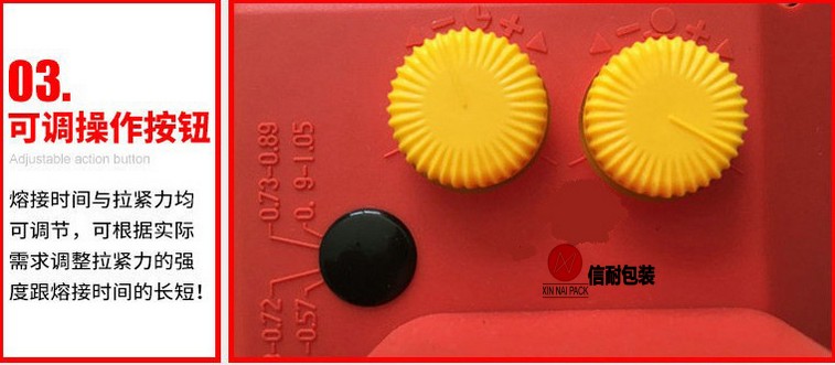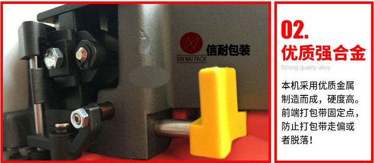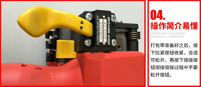 操作方法: 將塑鋼帶或塑料打包帶,從上往下纏繞捆包物體一圈后,將打包帶接頭處放入機器工作槽內,由電機帶動束緊輪,將打包帶束緊,通過摩擦作扣的方式將帶粘接,最后自動進行切帶。