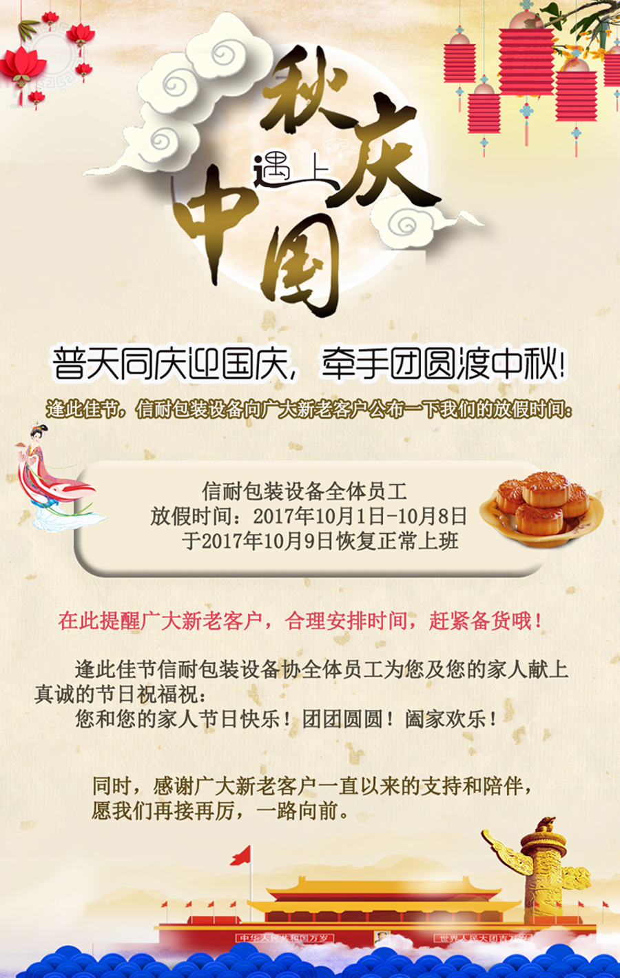 國慶節假期馬上就要到了,尤其是傳統的中秋佳節適逢國慶長假,小伙伴們有了更充足的時間和家人團聚、出游,享受美食和快樂的假日時光。上海信耐包裝提前祝福我們的客戶、員工及您的家人: